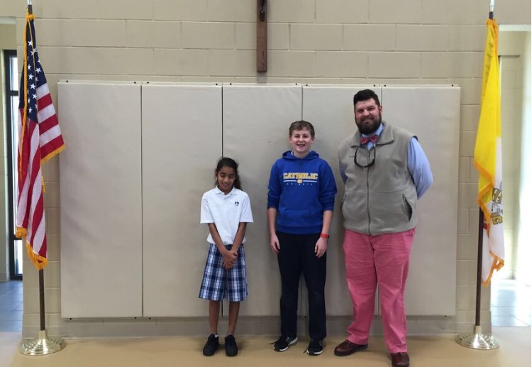 Pictured: Montgomery Catholic’s Holy Spirit Campus Spelling Bee winner Natalie Ajmal with runner-up Zach Izer and school principal Mr. Matthew Monson after the school Spelling Bee.