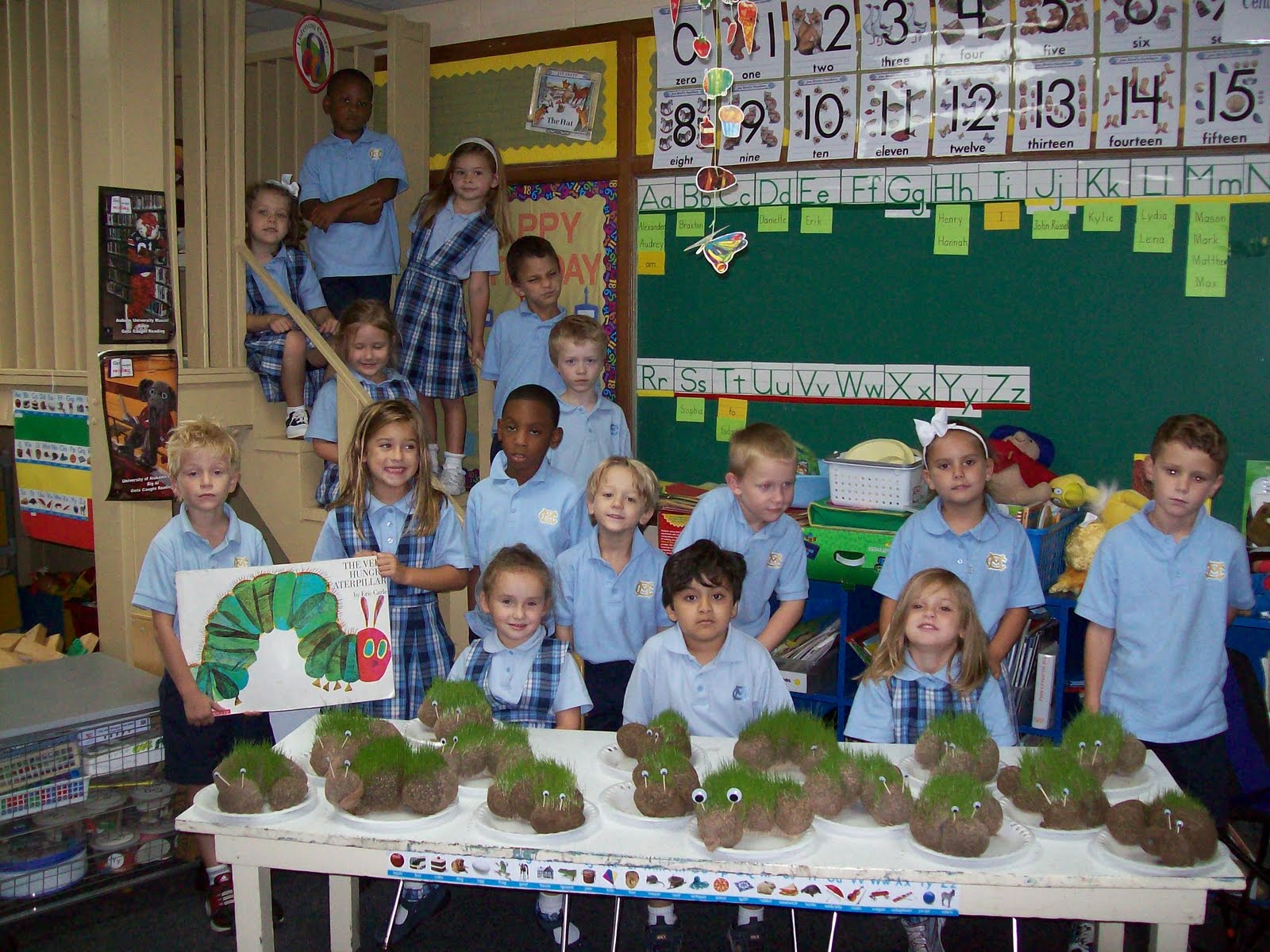 Kindergarten students in Mrs. Redden’s class at Montgomery Catholic Preparatory School just completed their study of children’s author Eric Carle. To celebrate, each student created a “very hungry caterpillar” from potting soil, grass seeds, rubber bands, and wiggly eyes. After the unit was complete, each student took their very hungry caterpillars home to enjoy.