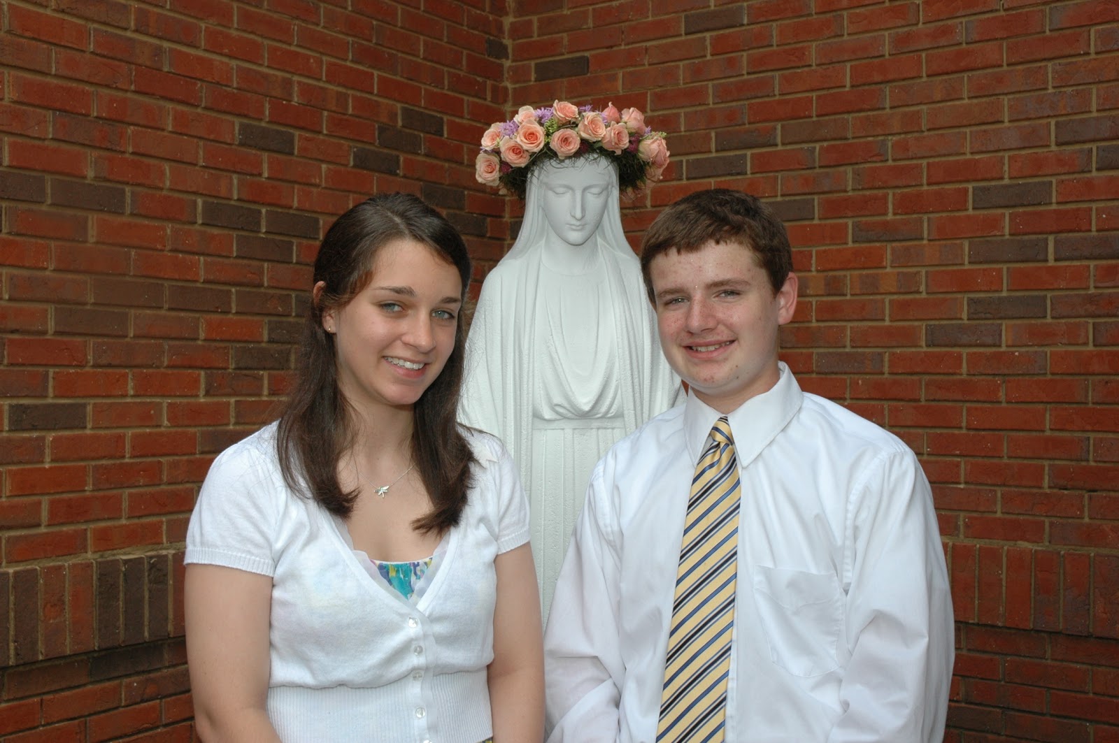 Middle school students at Montgomery Catholic Preparatory School recently honored the Blessed Mother’s special month of May with a traditional May Crowning ceremony held in front of the Dr. Doyle Building on May 9. Eighth grade students Paige Barranco and Leo Petters were selected as crown bearers by the middle school faculty for this year’s ceremony. Faculty members Kerri Moore and Vicki Petters sang beautiful A cappella songs as the seventh and eighth grade student body gathered in front of the school building. The Our Lady of Grace statue used in the annual May Crowning ceremony was donated by Mary Azar and Frances Miaoulis and blessed by Bishop Toolen on April 12, 1945. The statue was centered in front of our original school from 1945 until 1965. The Our Lady of Grace statue was relocated to the front of our Dr. Doyle Middle School Building and rededicated by Archbishop Oscar Lipscomb on September 12, 2004. Pictured: Paige Barranco and Leo Petters served as middle school crown bearers during Montgomery Catholic’s May Crowning ceremony.