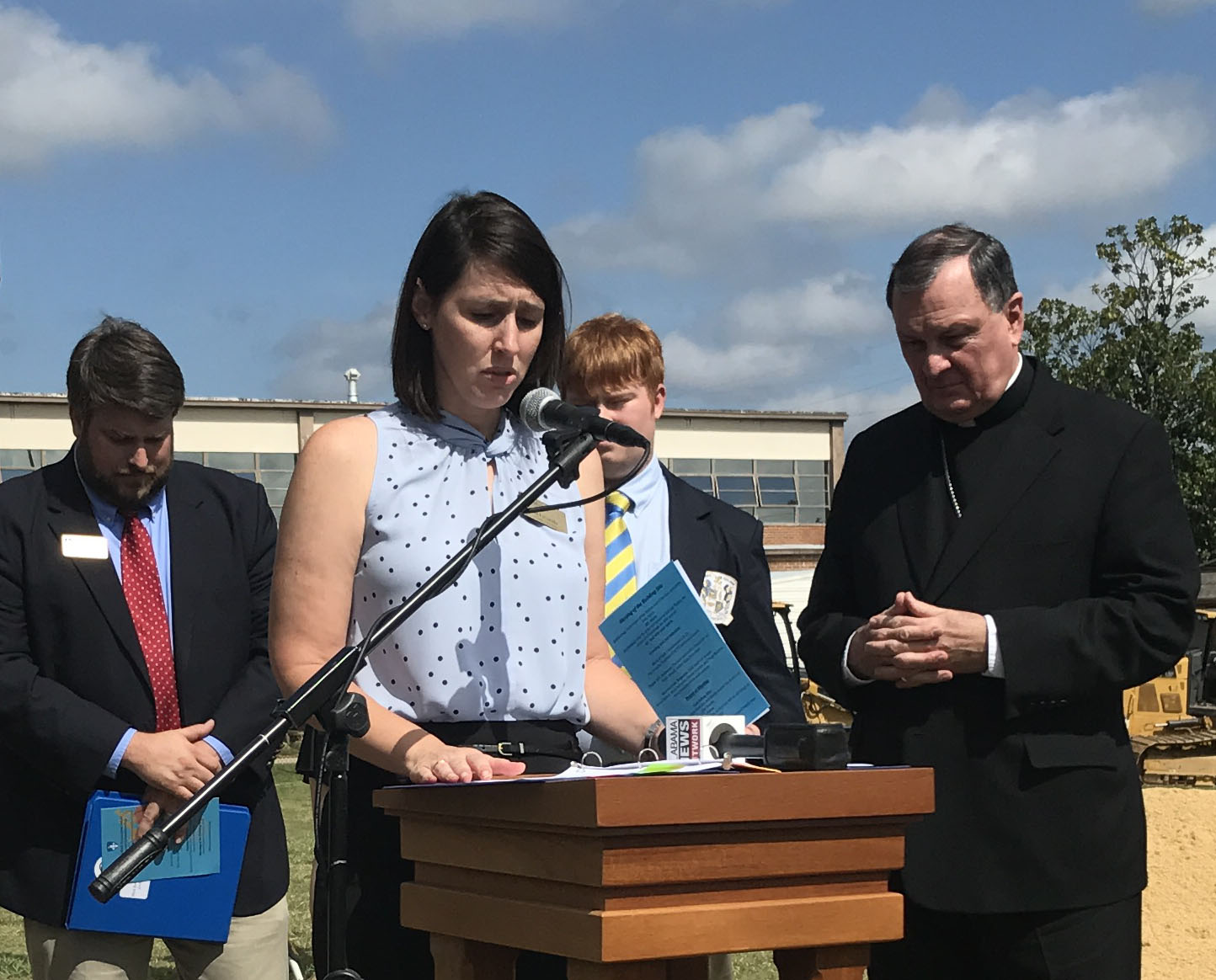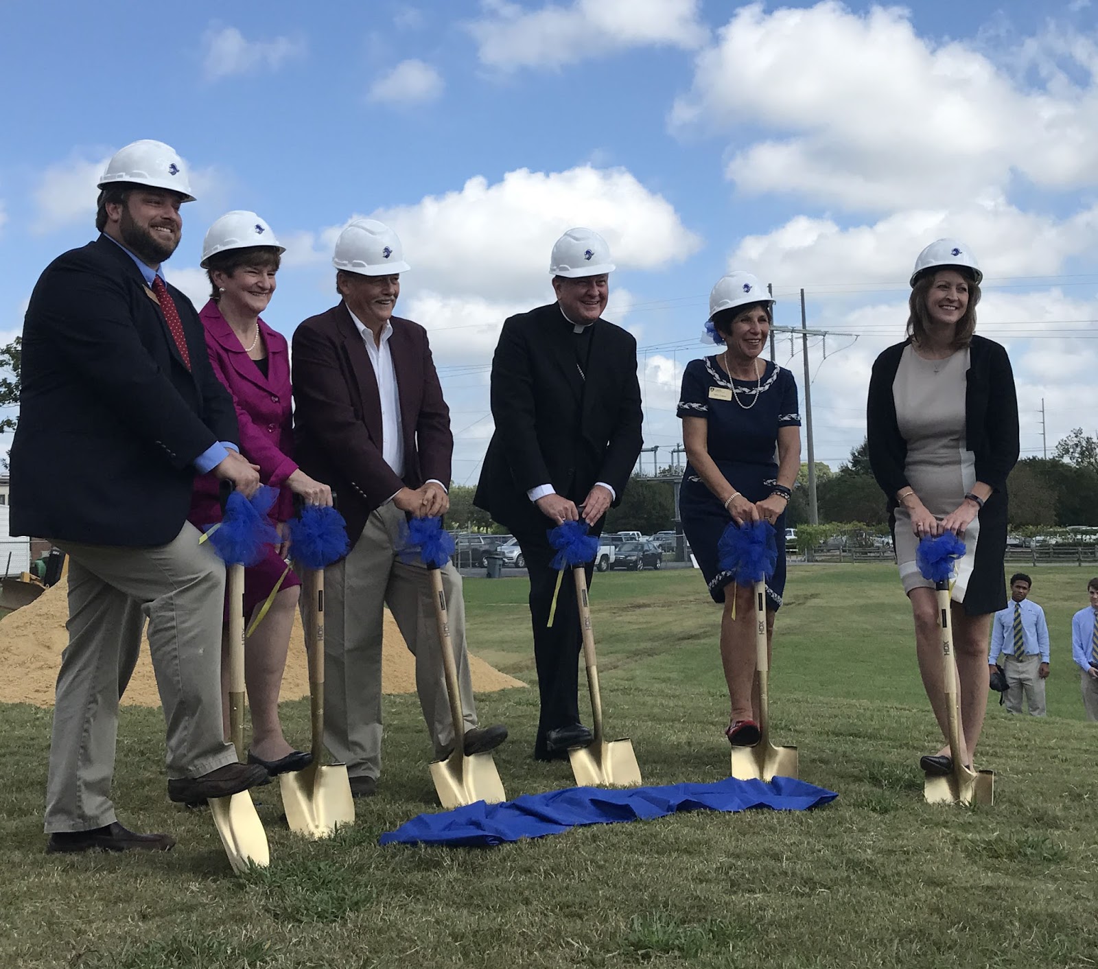 Other distinguished guests included: Reverend Victor Ingalls, Reverend Nicholas Napolitano, Reverend Alex Valladares, Holy Spirit Campus Principal Nancy Foley, St. Bede Campus Principal Laurie Gulley, Middle School Assitant Principal Julie Wood, Athletic Director Daniel Veres, Band Director Alex Johnson,and Seawell McKee, McKee and Associates Architecture and Interior Design who were joined by the Capital Campaign volunteers, parents, students and larger Montgomery Catholic community. All were happy to witness the start of the project with Archbishop Rodi’s blessing of the work site.