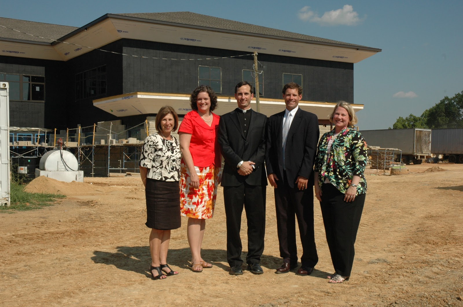 Pictured: Montgomery Catholic Preparatory School’s Holy Spirit Campus leadership team stand in front of the new building opening in August. From left to right, Anne Ceasar, Laurie Gulley, Reverend Patrick Driscoll, Ken Klinger, and Mary Kelley. Photo by Anna Lee Ingalls.