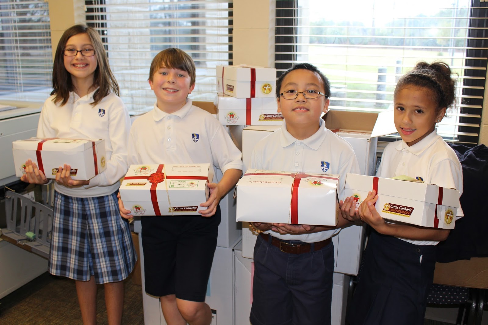 Fourth grade students Owen Thompson, Isabella Munoz, Jessica Hankins and Ben Nguyen help load up “Boxes of Joy” at the MCPS Holy Spirit campus. Each Montgomery Catholic Preparatory School family received a box to fill for a needy child in support of the Cross Catholic Outreach program. Every year, thousands of poor children experience a Christmas without hope, Montgomery Catholic is blessed by a generous community who seems to always give more. The middle/high school campus acted as the Central Alabama collection center. The high school students loaded almost 1,000 boxes in mid-November, all headed to Guatemala and Haiti. Learn more at: www.crosscatholic.org/boxofjoy.