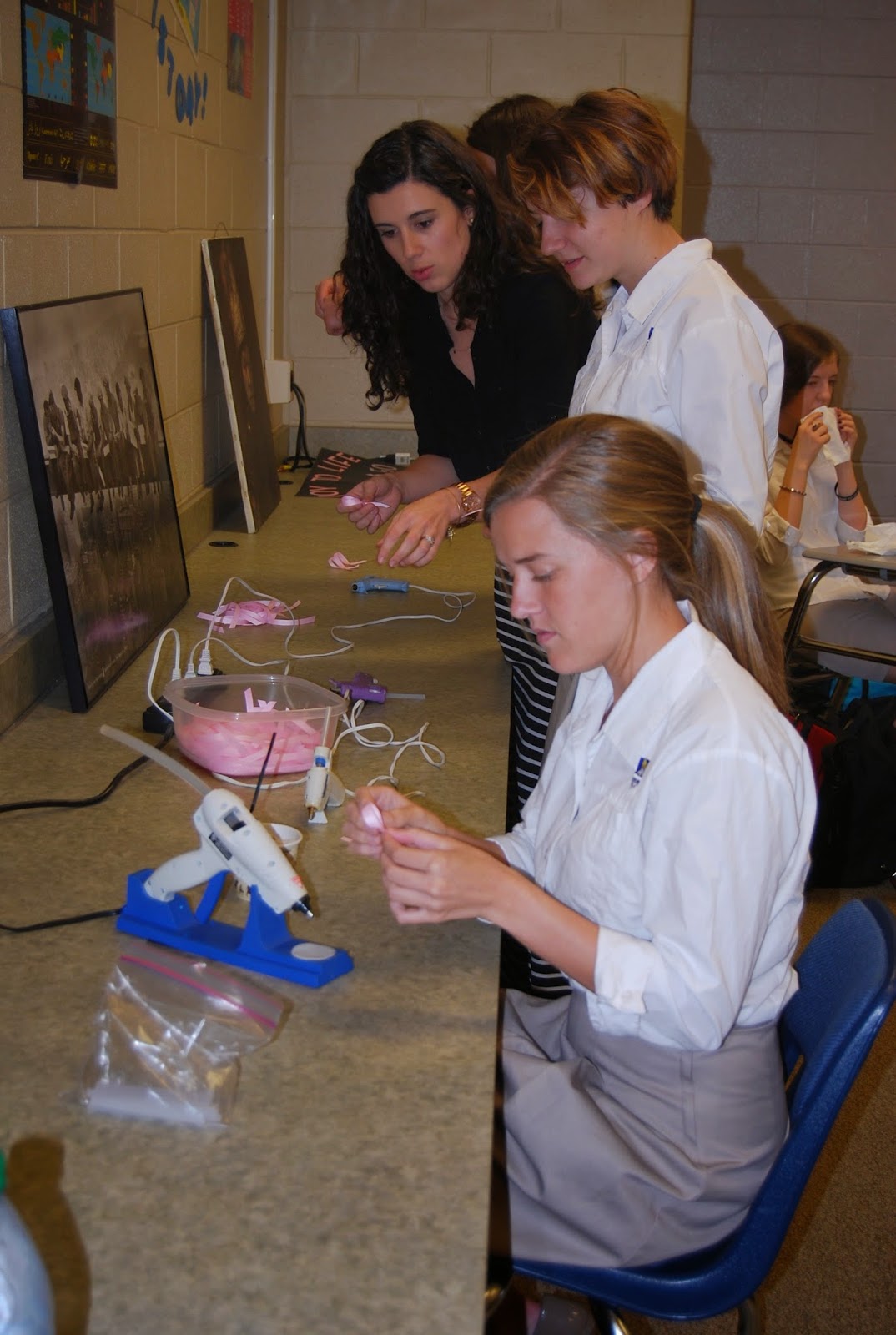 Thirty members of the Montgomery Catholic Preparatory School’s Young Women’s Leadership Club worked together during lunch meetings to make pink ribbons to sell for .50 – $1.00 each in support of the Joy to Life Foundation. Mrs. Stephanie Nelson (pictured far right) and Coach Abby Beesley are the teacher sponsors for the group and helped Maria Celli and Katie Reeves make the ribbons during an October meeting. The group will donate over $150 to Joy to Life by the end of October.